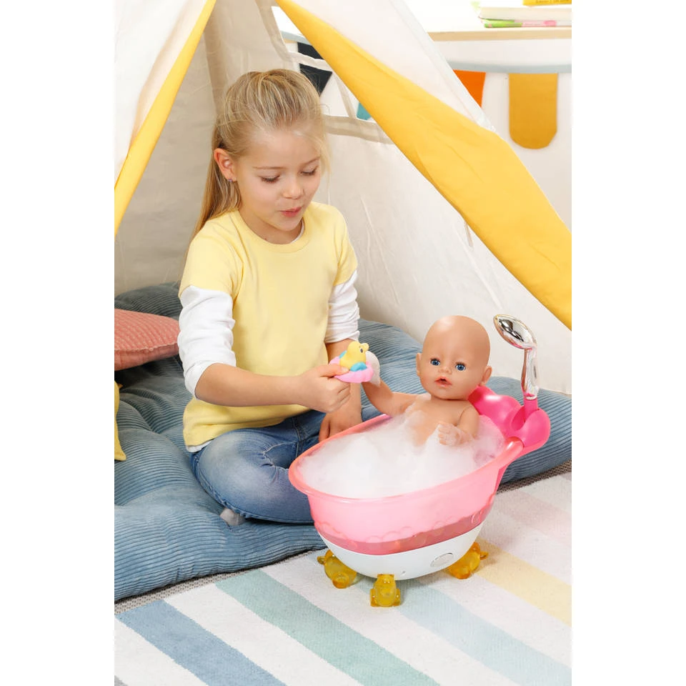 Slapen, eten en in bad gaan zijn haar favoriete activiteiten. Ze vindt het heerlijk om water te drinken uit haar fles. Daarna kan ze een plasje doen in haar luier of op haar potje en echte tranen huilen. BABY born kan niet alleen water drinken, maar ook pap eten. Daarna doet ze zelfs een grote boodschap. Haar armen, benen en hoofd zijn heel beweeglijk, zodat het aan- en uittrekken van haar trendy kleding kinderspel is. Het Soft Touch-lichaam is heerlijk zacht.
