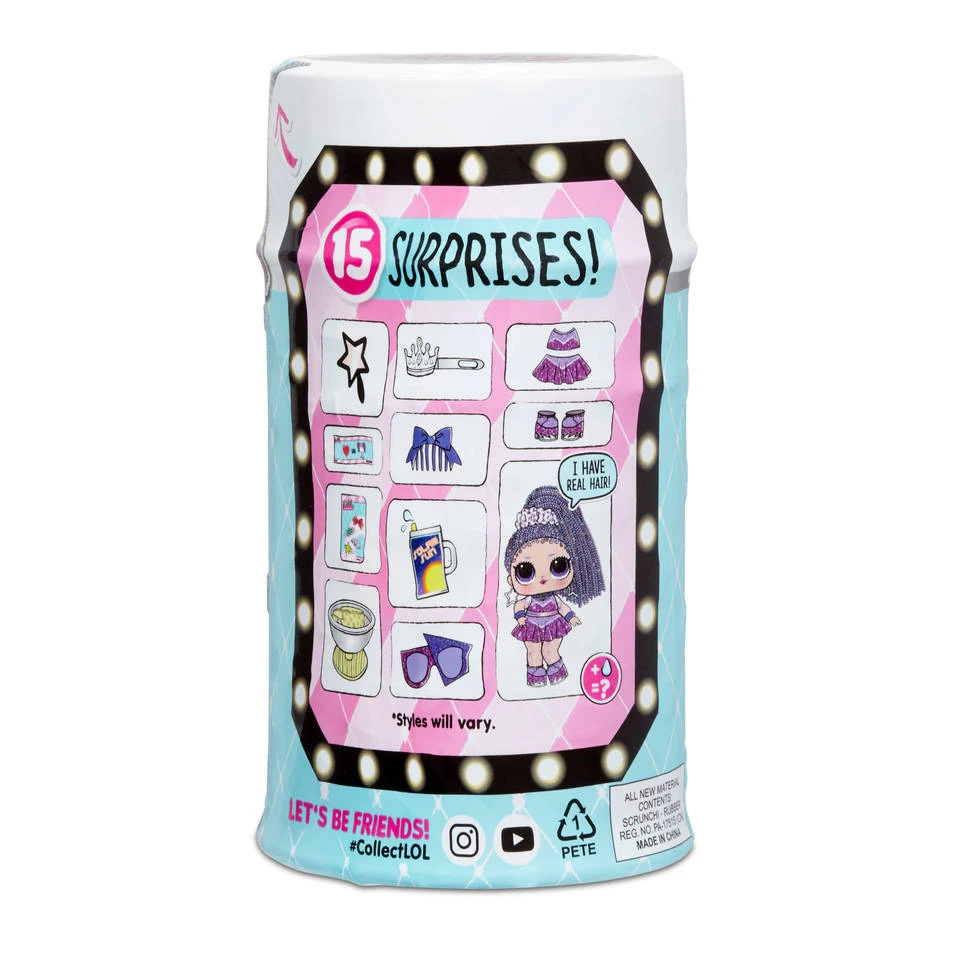 - Vijftien verrassingen inbegrepen waaronder een papieren spiegelaccessoire, een geheim bericht, een stickervel, een salonstoel, een kam, een beker, accessoires, mode, schoenen, L.O.L. Surprise! Hairgoals pop met echt haar.