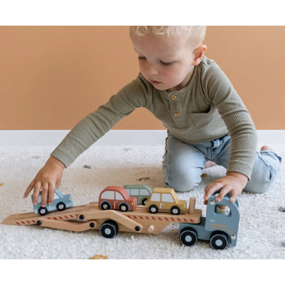 Kinderen bedenken hun eigen avonturen met deze mooie, houten truck met een oplegger en vier auto’s van Little Dutch.