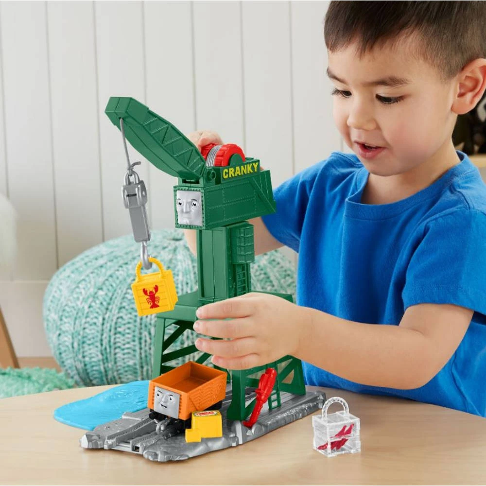 Niets is te zwaar voor Cranky: of het nu een kist vol spelplezier of een krat vol avonturen is. Met de Thomas & Friends Cranky de hijskraanspeelset kunnen kleine conducteurs hun nieuwe vriendje helpen met het verplaatsen van ladingen. Je kunt aan de ene knop draaien om de haak van Cranky te laten zakken en de kratten te verzamelen en aan de andere om hem te laten draaien. Met een hendel op het spoor houd je de Trammelant Truck tegen zodat Cranky hem kan bereiken.