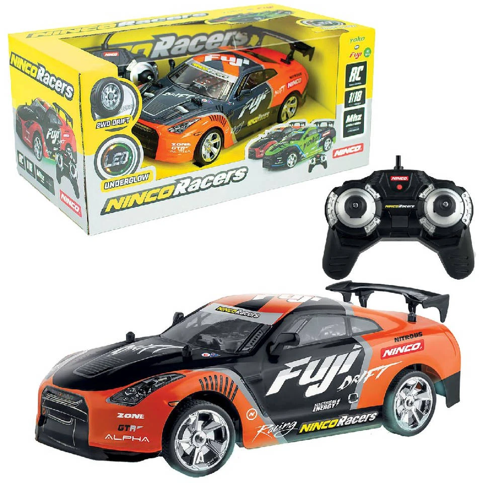 De Ninco RC Fuji driftauto heeft neonlichten aan de onderkant en is gebouwd op een schaal van 1:18. De auto is uitgevoerd in stoere oranje kleurstelling met zwarte accenten. De zender kan op verschillende frequenties worden gezet, zodat jij en je vrienden samen kunnen racen. De zender en de auto zijn exclusief 4 AA-batterijen voor het voertuig en 2 AA-batterijen voor de zender.