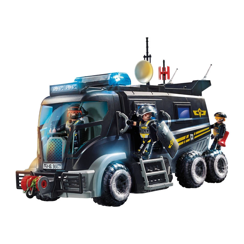 “Oproep aan alle eenheden: een verdachte gaat ervandoor in een amfibievoertuig!”, klinkt het door de radio. De agenten van het Speciaal Interventie Eskadron starten meteen hun truck met licht en geluid en gaan op pad. Met hun truck coördineren ze alle eenheden te land, te water en in de lucht. Snel de sirene inschakelen en dan kunnen ze op pad. De schurk vlucht over moeilijk begaanbaar terrein, maar dat is geen probleem voor de truck met de beweegbare dubbele as. Tegen deze gebundelde kracht van de politie maakt de schurk geen schijn van kans!Cool geluid: met de schakelaar aan de onderkant van de geluidsmodule kan tussen twee sirenegeluiden worden gewisseld.
